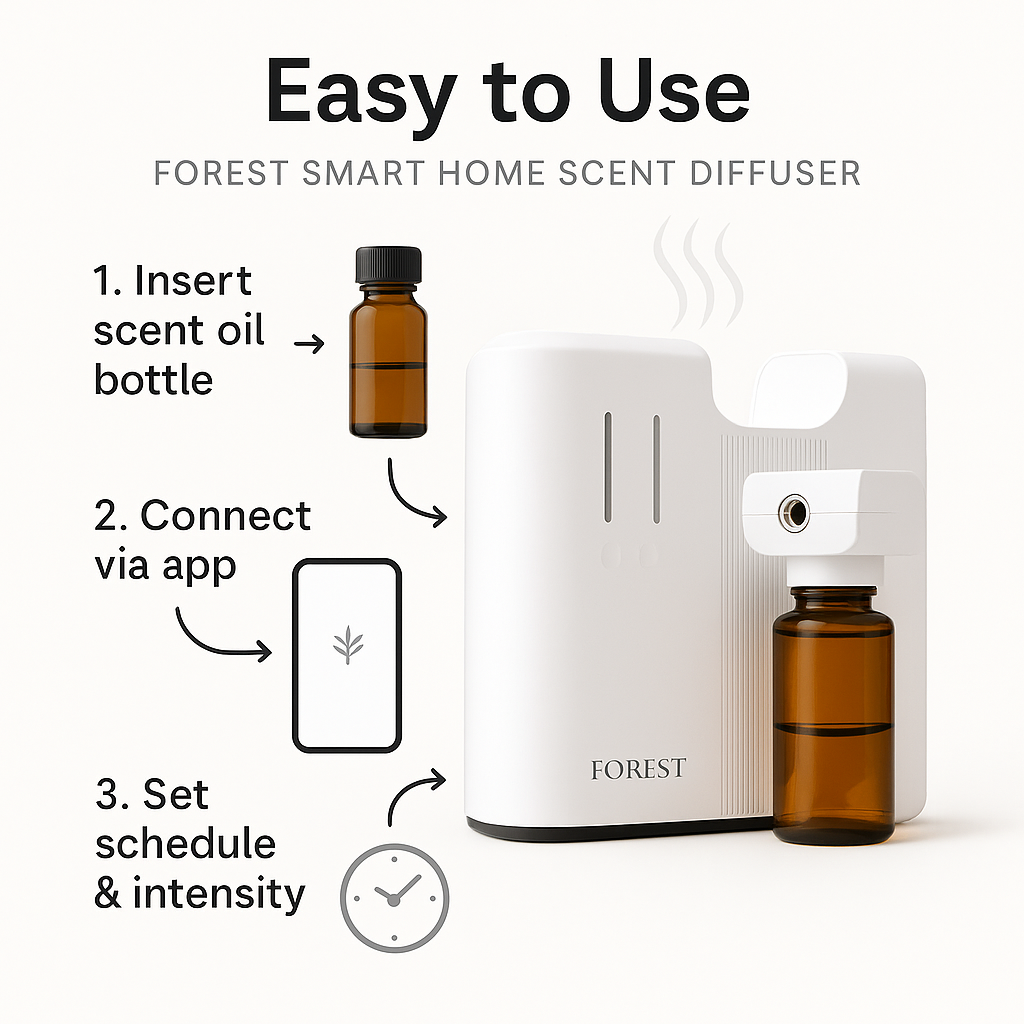Enjoy elegant home scenting with the Forest Smart Home Aroma Diffuser. Using waterless cold-air diffusion, this compact, ultra-quiet device evenly disperses fragrance throughout your space — all controlled from your phone. Ideal for bedrooms, living rooms, and apartments, the Forest diffuser combines minimalist style with powerful performance.